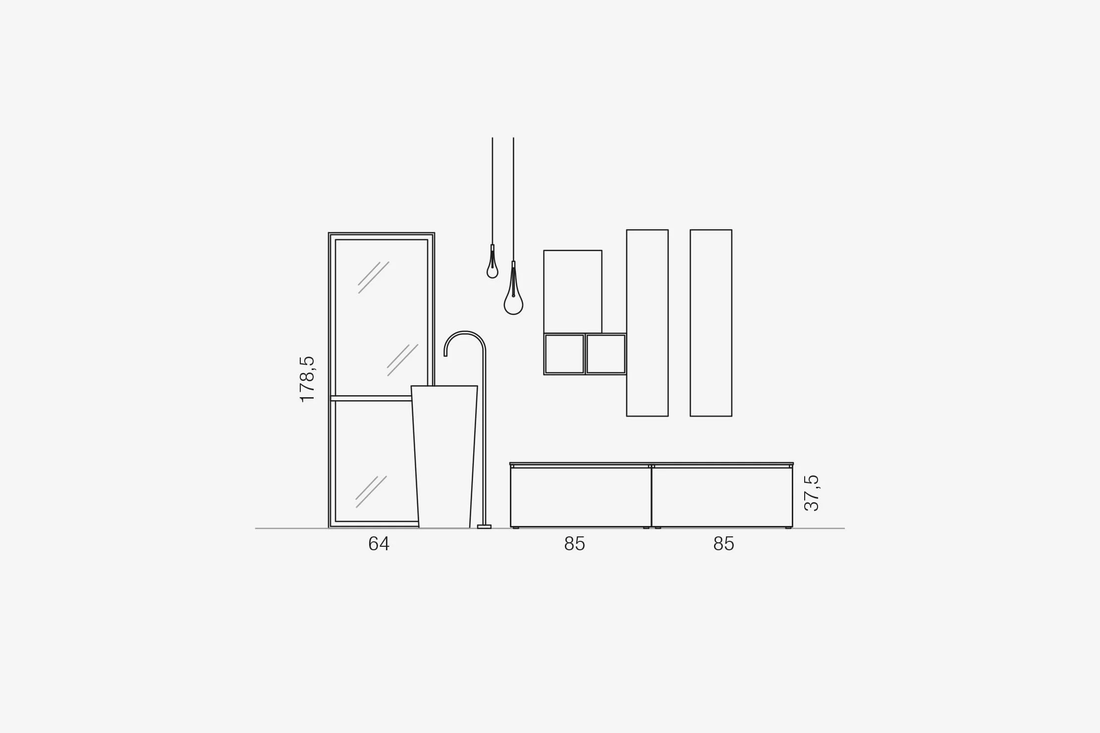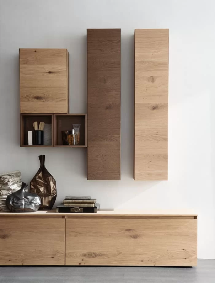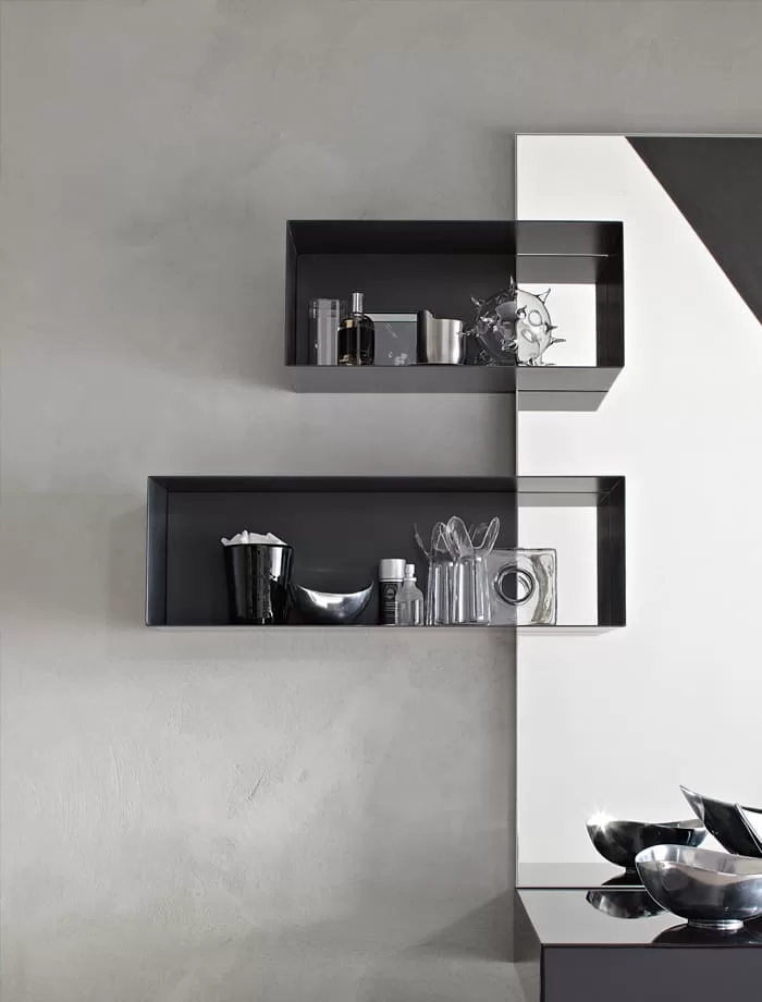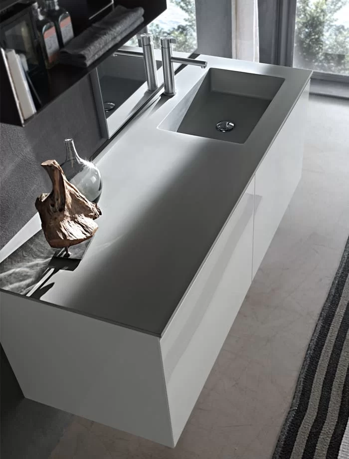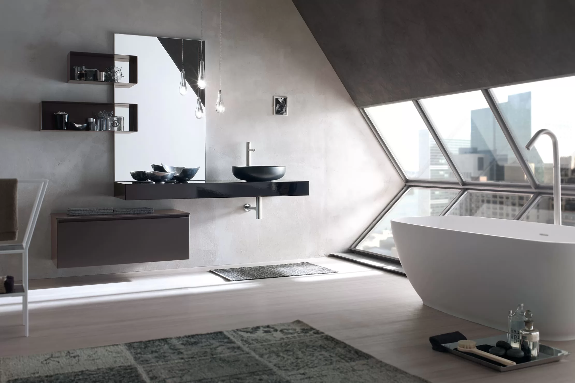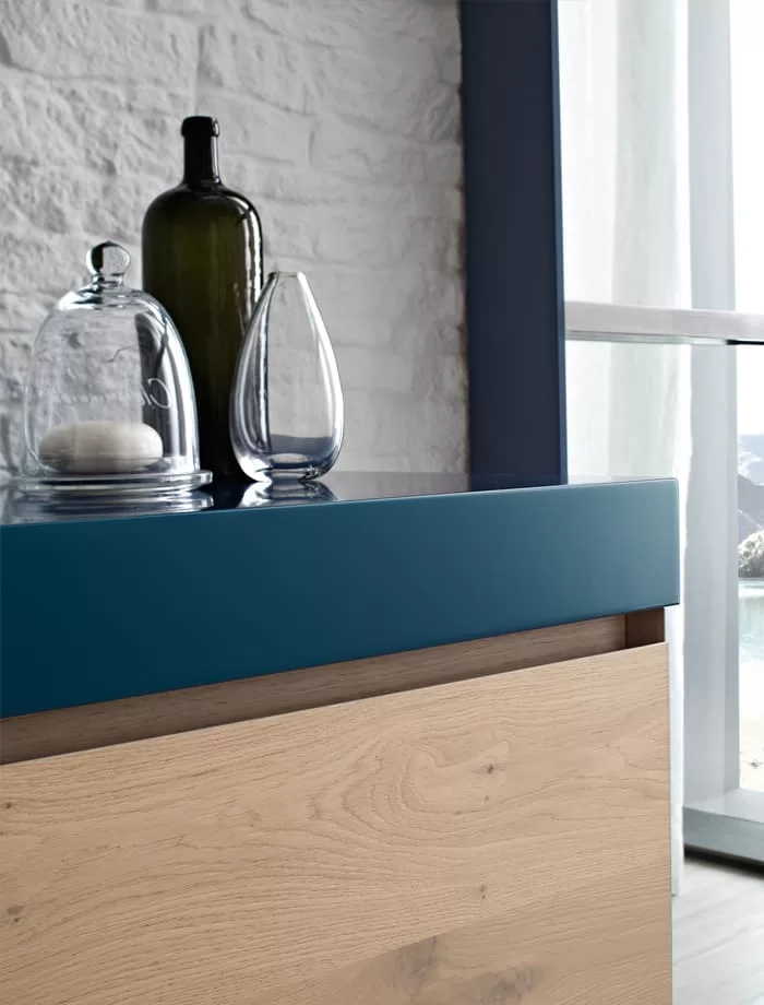 Una collezione dalle linee minimal di grande personalità, grazie all’anta con angolo a 45° che diventa maniglia e valorizza le finiture.