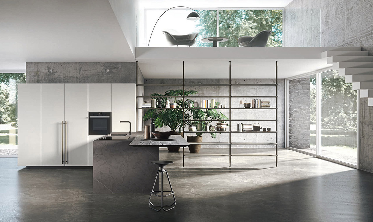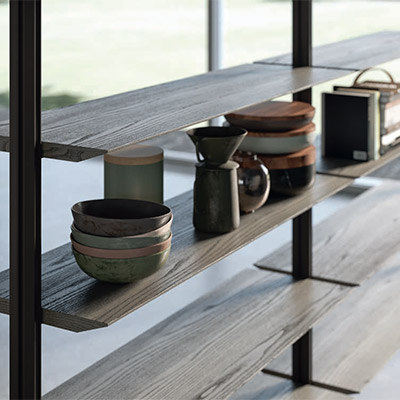 Mit minimalistischem Design und äußerst einfacher Montage zeichnet sich das selbsttragende Aluminiumsystem Open System aus; es ermöglicht die freie Positionierung von Behältern und Regalböden – hier in der Ausführung Olmo Cenere mit abgeschrägten Kanten. Open System ist wahlweise zur Befestigung zwischen Boden und Decke oder mit wandmontierten Ständern erhältlich.