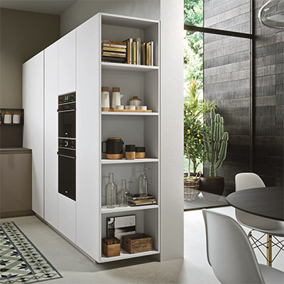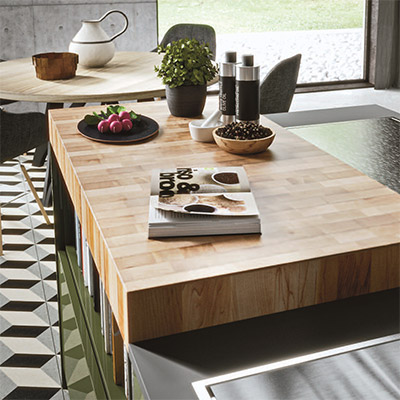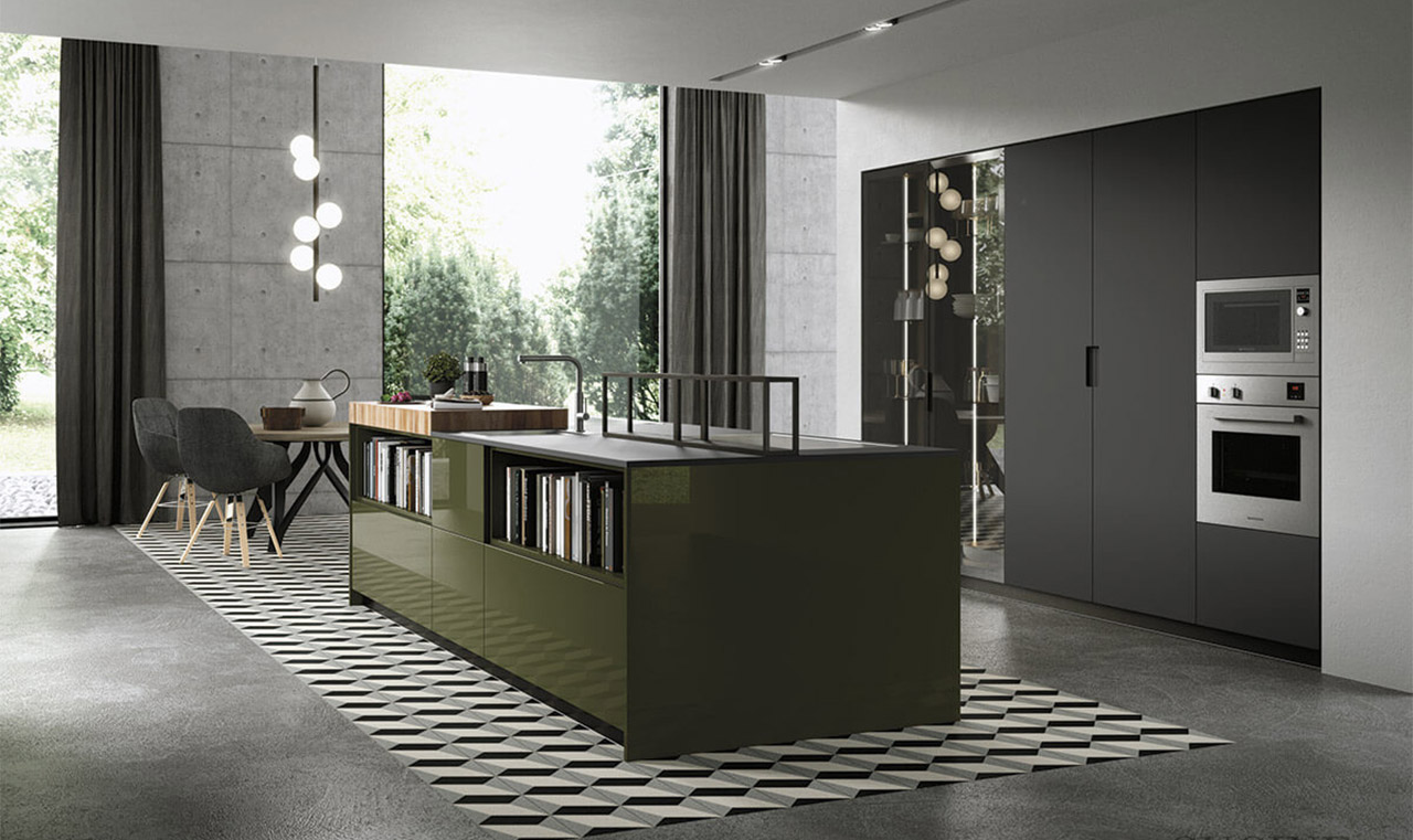 The contrast between the glossy surface of the olive-green lacquered doors and the natural tones of the solid-wood chopping board adds a subtly retro touch to the kitchen’s contemporary character. The play of open and closed spaces makes the island—where the core kitchen tasks are concentrated—even more versatile.